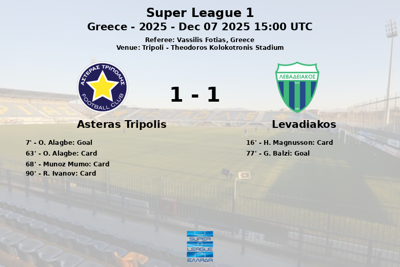Trípoli, Grécia – Num jogo disputado no Estádio Theodoros Kolokotronis, Asteras Tripolis e Levadiakos empataram em partida válida pela 13ª jornada da Super League 1. O jogo, apitado pelo árbitro Vassilis Fotias, foi marcado por uma notável diferença na posse de bola, com 72% para o Levadiakos contra 28% do Asteras Tripolis.