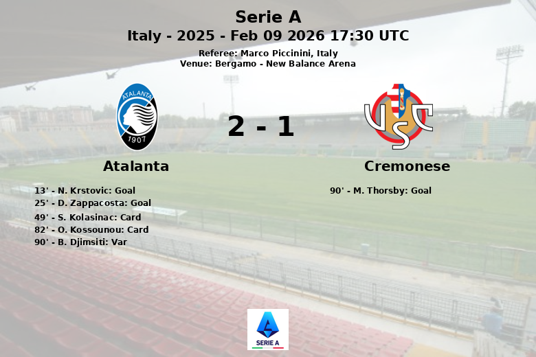 O final da partida foi cheio de emoção. Um gol de B. Djimsiti para a Atalanta foi anulado pelo VAR por impedimento aos 90 minutos. Imediatamente depois, M. Thorsby, do Cremonese, conseguiu diminuir a diferença com um gol aos 90 minutos, assistido por S. Luperto, dando um final emocionante à partida. A partida, arbitrada por Marco Piccinini, foi disputada com intensidade, refletida nas 11 faltas cometidas por cada equipe e nos dois cartões amarelos recebidos pela Atalanta.