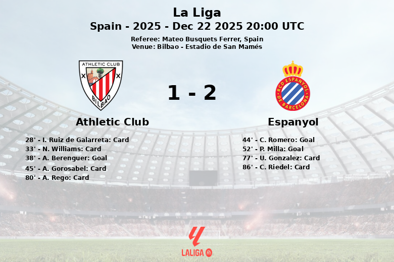 O Athletic abriu o placar aos 38 minutos com um gol de A. Berenguer. No entanto, a alegria local não durou muito, já que C. Romero empatou para o Espanyol pouco antes do intervalo, aos 44 minutos. No segundo tempo, P. Milla colocou o Espanyol à frente aos 52 minutos, com assistência de T. Dolan. Apesar dos esforços do Athletic para reagir, o Espanyol conseguiu manter a vantagem até o final.