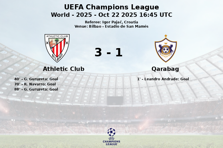 Bilbao, 22 de outubro de 2025 – O Athletic Club impôs-se com autoridade ao Qarabag no Estádio de San Mamés, em um encontro correspondente à fase de grupos da UEFA Champions League. Apesar de o Qarabag ter surpreendido inicialmente com um gol madrugador de Leandro Andrade no minuto 1, a equipe local reagiu com contundência.