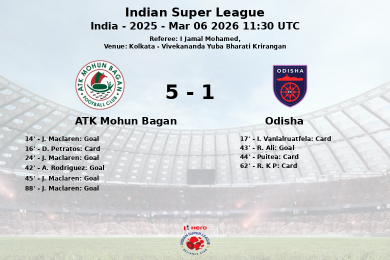 A partida também foi marcada pela intensidade, refletida nos cartões amarelos mostrados a D. Petratos (ATK Mohun Bagan) e I. Vanlalruatfela (Odisha) no primeiro tempo, seguidos por Puitea e R. K P do Odisha.
