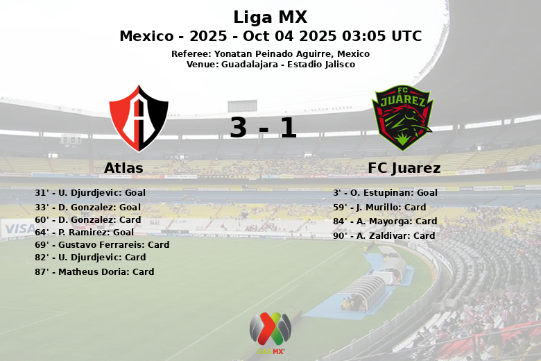 Guadalajara, México – Em um jogo vibrante disputado no Estádio Jalisco, o Atlas derrotou o FC Juárez com uma atuação sólida. A partida, correspondente à 12ª rodada do Apertura da Liga MX, temporada de 2025, começou com um gol rápido de O. Estupiñán aos 3 minutos, dando ao FC Juárez a liderança inicial graças a uma assistência de J. Murillo. No entanto, o Atlas reagiu com força. U. Djurdjevic empatou aos 31 minutos em cobrança de pênalti, seguido por um gol de D. Gonzalez aos 33 minutos, com assistência de S. Hernandez, dando a vantagem ao Atlas. No segundo tempo, P. Ramirez ampliou a vantagem aos 64 minutos, assistido por D. Gonzalez, consolidando o domínio do Atlas.