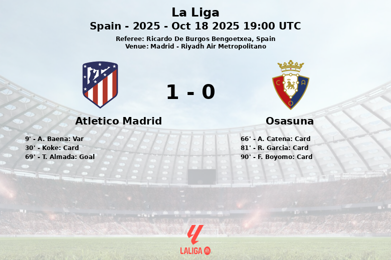 Madrid, 18 de outubro de 2025 – O Atlético de Madrid venceu hoje o Osasuna no Riyadh Air Metropolitano, em partida válida pela nona rodada de La Liga. O jogo, arbitrado por Ricardo De Burgos Bengoetxea, foi marcado pela alta tensão e jogo físico, refletidos nas inúmeras faltas e advertências.