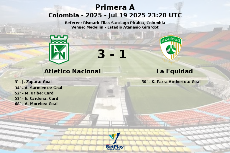 Em um jogo vibrante disputado no Estádio Atanasio Girardot, em Medellín, o Atlético Nacional triunfou sobre o La Equidad com um placar de 3-1, em partida válida pela segunda rodada do Clausura da Primera A colombiana. A equipe “Verdolaga” demonstrou sua superioridade desde o início, inaugurando o placar aos 3 minutos com um gol de J. Zapata, assistido por E. Cardona. O Atlético Nacional ampliou a vantagem aos 34 minutos, graças a A. Sarmiento, com assistência de M. Hinestroza.