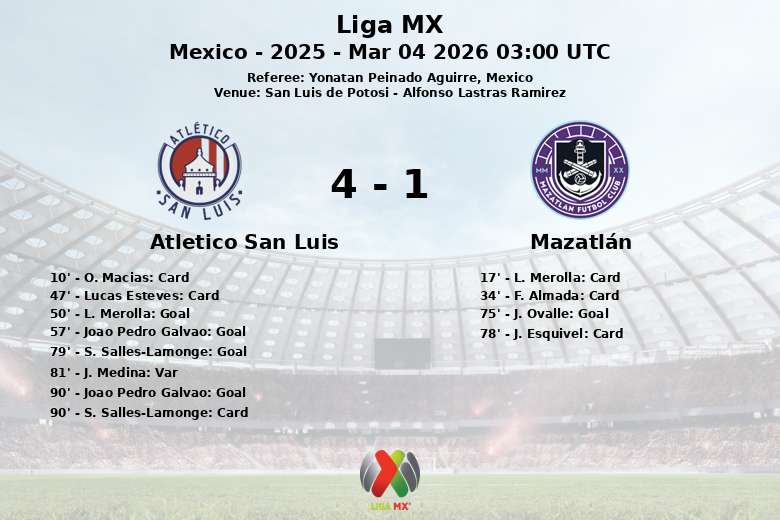 O segundo tempo viu uma chuva de gols. Um gol contra de L. Merolla aos 50 minutos abriu o placar para o Atlético San Luis. Pouco depois, Joao Pedro Galvao ampliou a vantagem com um gol aos 57 minutos. O Mazatlán respondeu com um gol de J. Ovalle aos 75 minutos, com assistência de M. Lainez, mas o Atlético San Luis permaneceu imperturbável. S. Salles-Lamonge marcou aos 79 minutos, embora um gol posterior de J. Medina tenha sido anulado após uma revisão do VAR. Nos acréscimos, Joao Pedro Galvao mais uma vez se fez presente no placar, selando a partida com seu segundo gol da noite aos 90 minutos, com assistência de M. Garcia.