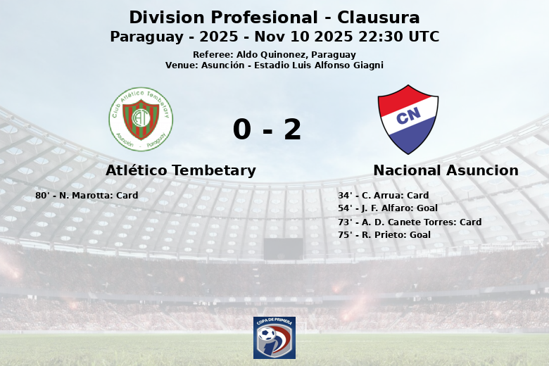 Substituiões na equipe de atlético tembetary: Aos 46 minutos, D. Zarate entrou e J. Amarilla saiu., Aos 60 minutos, J. F. Esteche entrou e A. Cristaldo saiu., Aos 60 minutos, W. Candia entrou e E. Perez saiu., Aos 74 minutos, J. Amarilla entrou e C. Favero saiu., Aos 78 minutos, D. Colman entrou e R. Rojas saiu.