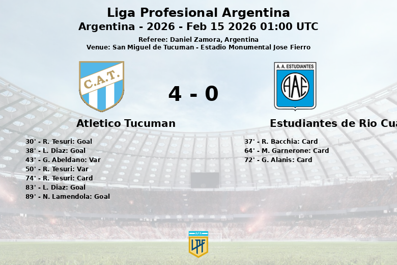 Finalmente, nos minutos finais, L. Diaz voltou a marcar aos 83 minutos, desta vez com assistência de K. Ortiz, e N. Lamendola selou a vitória aos 89 minutos, assistido por G. Compagnucci. O árbitro Daniel Zamora advertiu R. Bacchia, M. Garnerone e G. Alanis do Estudiantes de Río Cuarto, e R. Tesuri pelo Atlético Tucumán.