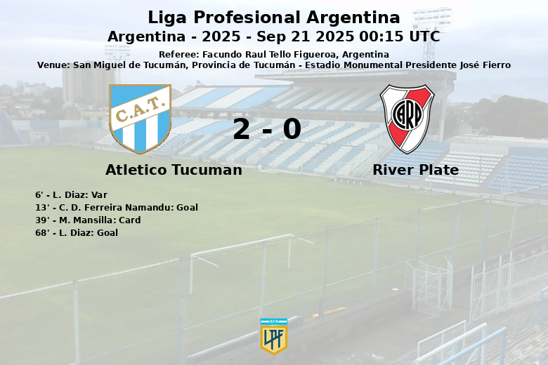 O Atlético Tucumán terminou a partida com 34% de posse de bola, 16 chutes (8 no gol), 10 escanteios e 12 faltas. O River Plate, por sua vez, teve 66% de posse de bola, 17 chutes (apenas 2 no gol) e 4 escanteios. O árbitro Facundo Raul Tello Figueroa apitou a partida correspondente à 9ª rodada da Liga Profesional Argentina de 2025.