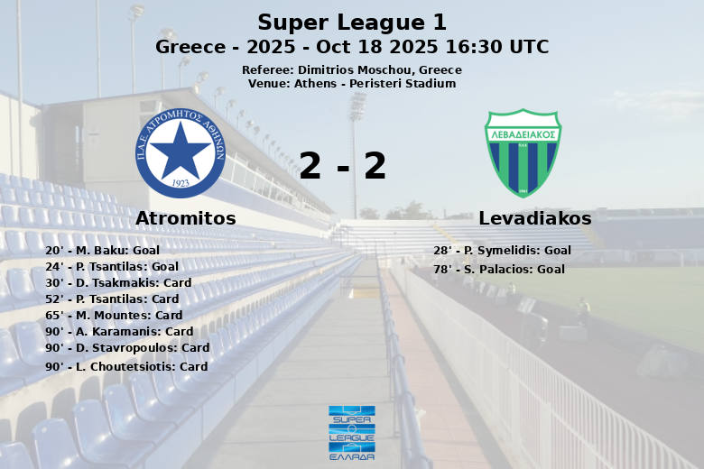 Atenas, 18 de outubro de 2025 – Um jogo vibrante aconteceu hoje no Estádio Peristeri, onde Atromitos e Levadiakos empataram em partida válida pela 7ª rodada da Super League 1. Sob a arbitragem de Dimitrios Moschou, o jogo foi marcado pela intensidade e cartões.