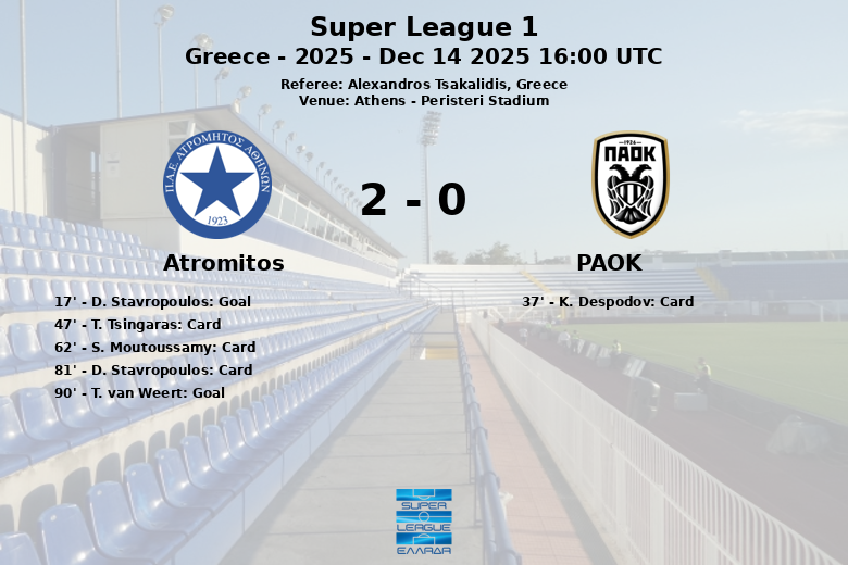 Atenas, Grécia – Em uma partida disputada no Peristeri Stadium, Atromitos e PAOK empataram em 1-1 em um confronto tenso e repleto de cartões. O jogo, correspondente à 14ª rodada da Super League 1, viu o Atromitos abrir o placar aos 17 minutos, com um gol de D. Stavropoulos, assistido por P. Michorl.