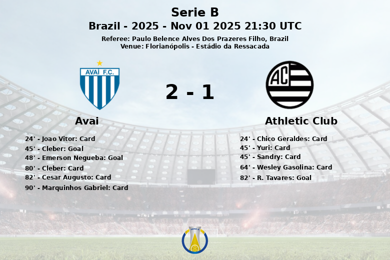 Florianópolis, Brasil – O Avai venceu o Athletic Club em um jogo disputado no Estádio da Ressacada, válido pela 35ª rodada da Série B brasileira. A partida, arbitrada por Paulo Belence Alves Dos Prazeres Filho, foi marcada por um alto número de cartões amarelos e dois pênaltis.