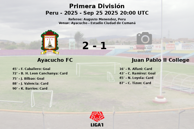O Juan Pablo II College abriu o placar aos 43 minutos com um gol de C. Ramirez. No entanto, a alegria durou pouco, já que, pouco antes do intervalo, F. Caballero empatou para o Ayacucho FC em cobrança de pênalti aos 45 minutos.