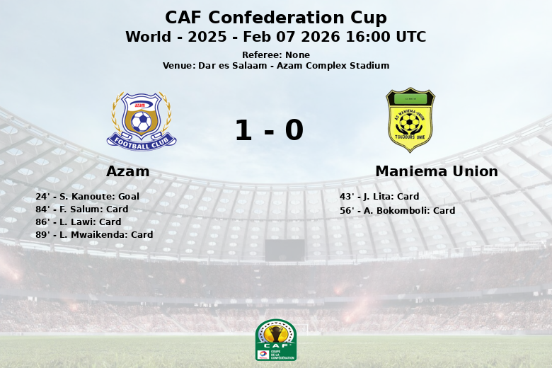 Dar es Salaam, 7 de fevereiro de 2026 – Em partida válida pela Taça da Confederação da CAF, o Azam conquistou uma vitória apertada contra o Maniema Union no Estádio Azam Complex. O único gol da partida aconteceu aos 24 minutos, cortesia de S. Kanoute, que aproveitou uma excelente assistência de I. S. Khamis para vencer o goleiro.