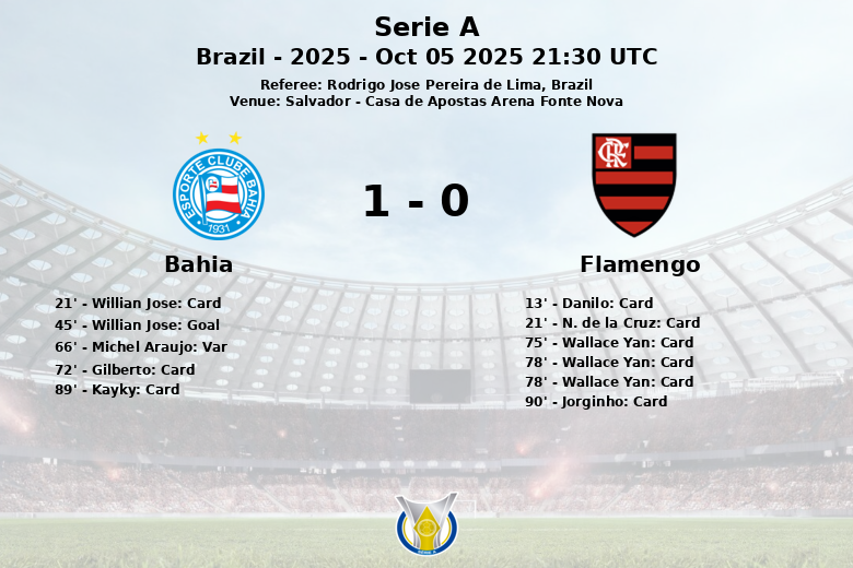 Embora o Bahia tenha tido um gol anulado por impedimento após a revisão do VAR aos 66 minutos, o time da casa conseguiu manter a vantagem e controlar a partida. As estatísticas finais refletem uma partida disputada, com o Bahia totalizando 10 chutes (4 no alvo) e o Flamengo 8 (3 no alvo). O Bahia cometeu 21 faltas, recebendo três cartões amarelos, enquanto o Flamengo cometeu 12 faltas e recebeu quatro cartões amarelos e dois vermelhos. A arbitragem de Rodrigo Jose Pereira de Lima foi muito criticada pelas decisões que afetaram ambos os lados.