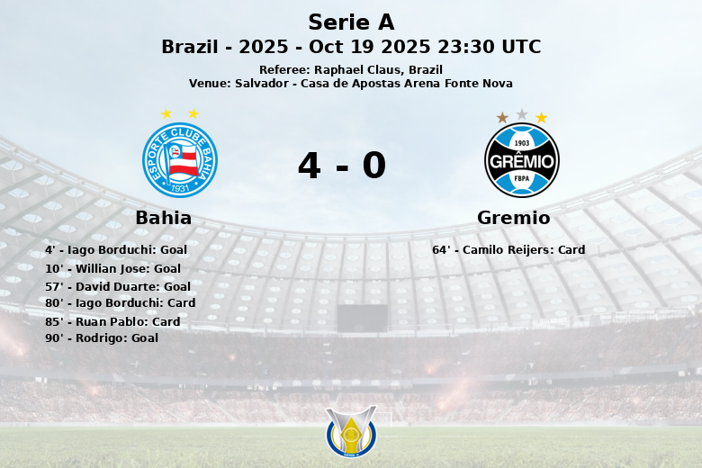 Nos acréscimos, Rodrigo selou a vitória com um gol aos 90 minutos, coroando uma atuação impecável do Bahia. Apesar de um jogo intenso que resultou em 22 faltas para o Bahia e 12 para o Grêmio, e alguns cartões amarelos para o time da casa e um para o Grêmio, a partida transcorreu sem maiores incidentes. O Bahia garantiu a vitória com 11 escanteios a seu favor contra 5 do Grêmio. O árbitro Raphael Claus apitou a partida válida pela 29ª rodada do Brasileirão Série A.