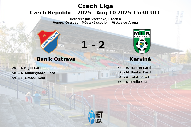 Substituiões na equipe de karviná: Aos 46 minutos, R. Storman entrou e A. Buzek saiu., Aos 67 minutos, S. Bohac entrou e E. Ayaosi saiu., Aos 67 minutos, O. Conde entrou e L. Ezeh saiu., Aos 87 minutos, A. Gning entrou e F. Vecheta saiu., Aos 90 minutos, D. Planka entrou e D. Samko saiu.