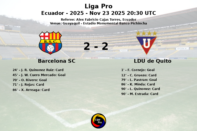 A partida, caracterizada por sua intensidade, deixou um saldo de seis cartões amarelos (três para cada equipe) e um vermelho para o LDU de Quito, mostrado a L. Quiñonez aos 90 minutos. O Barcelona SC demonstrou seu domínio na posse de bola e nos chutes a gol, mas não conseguiu traduzir essa superioridade em vitória. O LDU, por sua vez, foi eficaz em suas chegadas ao gol rival, apesar de ter menos oportunidades.
