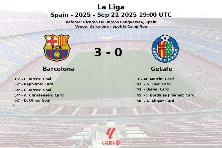 Apesar do domínio do Barcelona, a partida não foi isenta de tensão, com um total de seis cartões amarelos mostrados, quatro para jogadores do Getafe e dois para o Barcelona. O Getafe, embora com menos posse de bola, tentou gerar perigo com três chutes, dois deles no alvo. O Barcelona, por sua vez, gerou 15 chutes, seis direcionados ao gol rival.