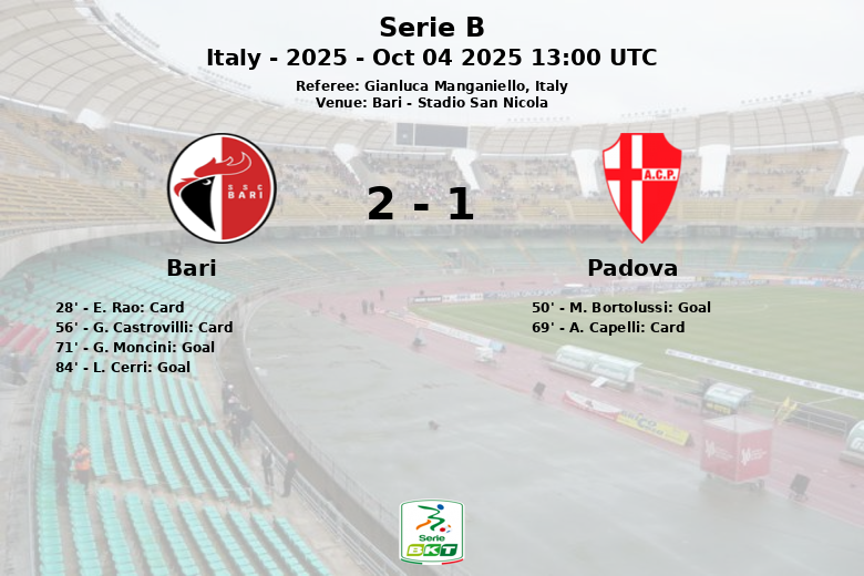 Num jogo disputado no Stadio San Nicola, o Bari conquistou uma importante vitória contra o Padova, embora com sofrimento. A partida, válida pela sétima rodada da Serie B, terminou com o placar de 2 a 1 a favor dos donos da casa.