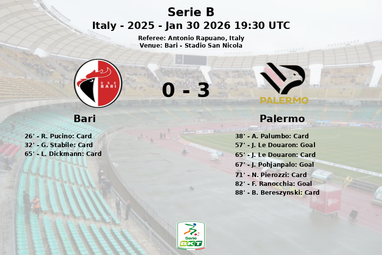 Bari, Itália – O Palermo conquistou uma vitória abrangente em sua visita ao Stadio San Nicola, superando o Bari com um placar final de 3-0. A partida, disputada como parte da Serie B, foi marcada pela intensidade e disciplina tática da equipe visitante.