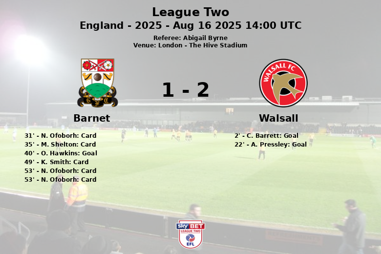 Londres, 16 de agosto de 2025 – Em um jogo disputado no The Hive Stadium, o Walsall saiu vitorioso contra o Barnet, embora a equipe da casa tenha dominado a posse de bola com 66%. A partida, arbitrada por Abigail Byrne e parte da terceira rodada da temporada regular da League Two, foi cheia de intensidade e momentos-chave.