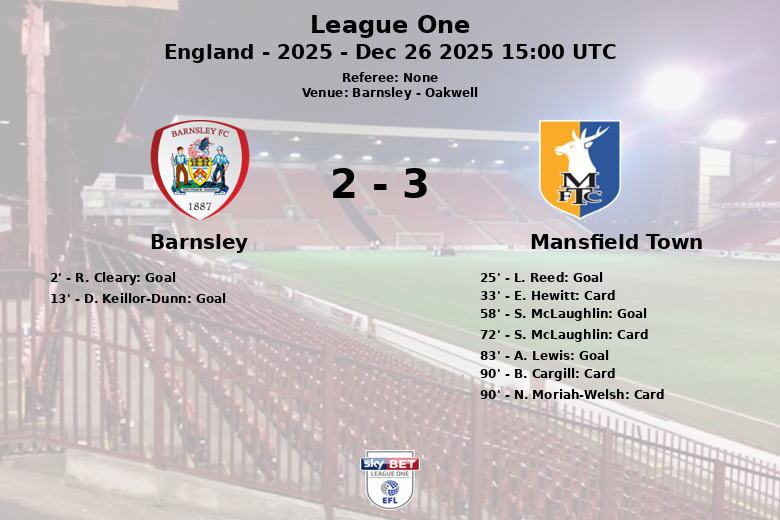 Barnsley, Inglaterra – Num jogo vibrante disputado em Oakwell, Barnsley e Mansfield Town empataram num encontro cheio de ação correspondente à 22ª jornada da League One. O Barnsley, dominando a posse de bola com 59%, adiantou-se cedo no marcador com golos de R. Cleary aos 2 minutos, assistido por P. Kelly, e de D. Keillor-Dunn aos 13 minutos, assistido por C. Vickers.