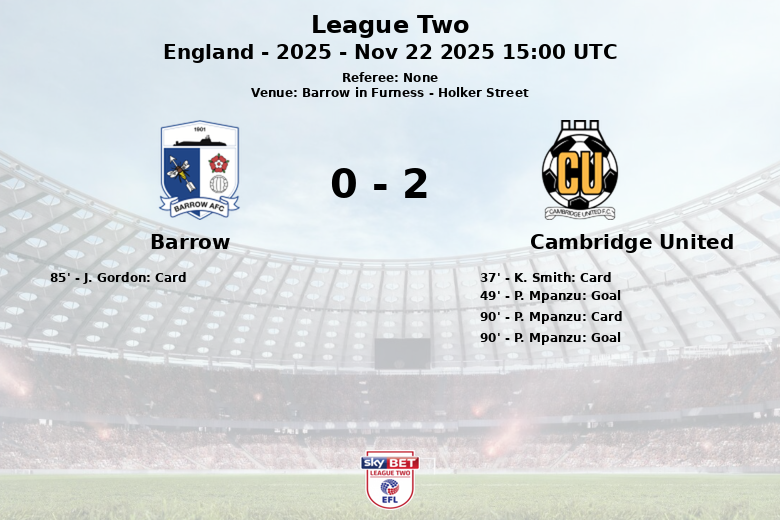 Barrow in Furness, Inglaterra – Em uma partida disputada em Holker Street, o Cambridge United derrotou o Barrow em um jogo da League Two da 17ª rodada. Apesar de dominar a posse de bola com 59%, o Barrow não conseguiu traduzir sua superioridade em gols. A partida, disputada em 22 de novembro de 2025, viu o Cambridge United, com 41% de posse de bola, aproveitar melhor suas oportunidades de ataque.