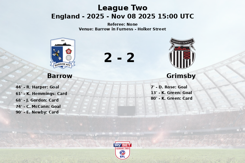 Barrow in Furness testemunhou um jogo vibrante entre Barrow e Grimsby que terminou em empate. O Grimsby assumiu a liderança cedo com gols de D. Rose aos 7 minutos e K. Green aos 13 minutos, criando uma vantagem inicial sólida. No entanto, o Barrow não desistiu e diminuiu o placar antes do intervalo graças a um gol de R. Harper aos 44 minutos, assistido por B. Whitfield. No segundo tempo, a pressão do Barrow deu frutos quando C. McCann igualou o placar aos 74 minutos, sem assistência. A partida foi marcada por um jogo físico, refletido nos três cartões amarelos mostrados aos jogadores do Barrow (K. Hemmings, J. Gordon, E. Newby) e um para K. Green do Grimsby. Estatisticamente, o Grimsby dominou a posse de bola com 54% contra 46% do Barrow, e também superou o seu rival em chutes totais (16 contra 11), embora ambas as equipas tenham registado um número semelhante de chutes à baliza (6 e 4 respectivamente).