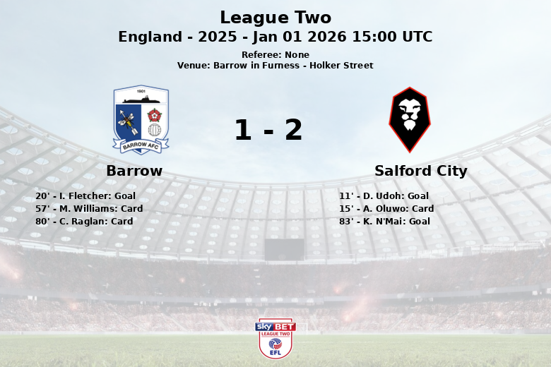 Barrow in Furness, Inglaterra – Uma partida disputada e cheia de alternativas foi vivida em Holker Street, onde Barrow e Salford City empataram em um encontro correspondente à jornada 24 da League Two. Salford City golpeou primeiro aos 11 minutos com um gol de D. Udoh, assistência de K. N’Mai. No entanto, o Barrow reagiu rapidamente e empatou aos 20 minutos graças a um gol de I. Fletcher, com assistência de B. Whitfield. O jogo foi caracterizado pela intensidade e pelo choque, refletido nos cartões amarelos para A. Oluwo (Salford City) e M. Williams e C. Raglan (Barrow). Quando parecia que o empate seria o resultado final, K. N’Mai marcou para o Salford City aos 83 minutos, assistido por D. Udoh. Quanto às estatísticas, o Barrow dominou a posse de bola com 57% e realizou 9 remates, enquanto o Salford City teve 43% de posse de bola e 12 remates. Ao final, o placar ficou dois a um favorecendo ao Salford City.