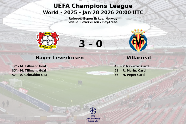 No segundo tempo, o Leverkusen continuou a pressionar, e A. Grimaldo ampliou a vantagem aos 57 minutos com um gol após assistência de Lucas. O Villarreal, embora tenha tentado reagir, não conseguiu converter suas oportunidades, totalizando cinco chutes, com apenas dois dirigidos ao gol, e recebendo mais dois cartões amarelos para R. Marin e N. Pepe. A partida terminou com um claro domínio do Leverkusen, que fez 15 chutes no total, sete deles no alvo, mostrando sua solidez ofensiva e defensiva. O Villarreal cometeu um total de 14 faltas, refletindo sua dificuldade em conter o jogo do Leverkusen. A partida, arbitrada por Espen Eskas, Noruega, foi disputada na BayArena em Leverkusen.
