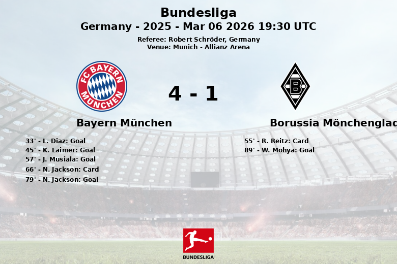 Munique, Alemanha – Em uma partida disputada em 6 de março de 2026, na Allianz Arena, o Bayern de Munique demonstrou sua superioridade ao vencer o Borussia Mönchengladbach por 4 a 1. O encontro, válido pela 25ª rodada da Bundesliga, foi amplamente dominado pela equipe da casa, que desfrutou de 70% da posse de bola.