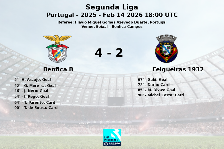 Seixal, Portugal – Num encontro repleto de emoções e gols, o Benfica B impôs-se com contundência ao Felgueiras 1932 no Benfica Campus. O jogo, correspondente à 22ª jornada da Segunda Liga portuguesa, viu H. Araujo abrir o marcador para o Benfica B aos 5 minutos. G. Moreira ampliou a vantagem antes do intervalo, marcando aos 42 minutos.
