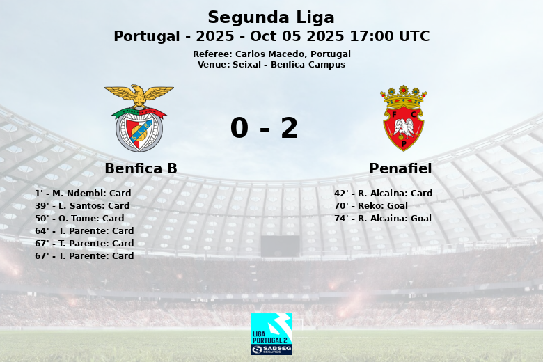 Seixal, Portugal – Em um jogo disputado no Benfica Campus, o Penafiel venceu o Benfica B com um placar final de 2-0. A partida, válida pela sétima rodada da Segunda Liga portuguesa, foi marcada pela alta intensidade e pelas numerosas advertências. O Benfica B acumulou cinco cartões amarelos e um vermelho, este último para T. Parente, enquanto o Penafiel recebeu um cartão amarelo. Reko abriu o placar para o Penafiel de pênalti aos 70 minutos, e R. Alcaina ampliou a vantagem aos 74 minutos. Apesar da intensidade do jogo, nenhuma das equipes conseguiu impor-se na posse de bola. A estatística de chutes, escanteios e faltas de ambas as equipes permaneceu igual. A arbitragem da partida ficou a cargo de Carlos Macedo.