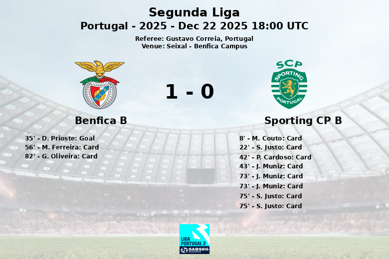 Seixal, Portugal – Um derby carregado de tensão e cartões entre o Benfica B e o Sporting CP B culminou com uma vitória apertada dos locais no Benfica Campus. O único golo da partida surgiu aos 35 minutos, marcado por D. Prioste de grande penalidade, dando a vantagem definitiva ao Benfica B.