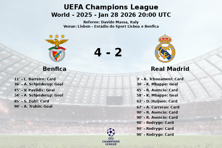 Lisboa testemunhou um jogo emocionante entre Benfica e Real Madrid no Estádio do Sport Lisboa e Benfica, correspondente à UEFA Champions League. A partida, marcada por alta tensão e arbitragem controversa, culminou em um placar final que reflete a intensidade vivida em campo.