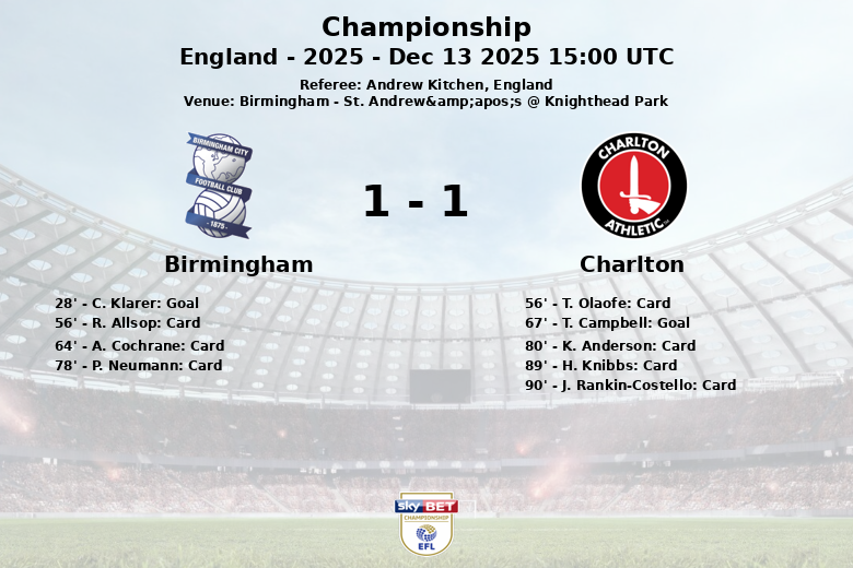 O Birmingham abriu o placar aos 28 minutos, com um gol de C. Klarer, assistido por T. Doyle, provocando alegria nas arquibancadas. No entanto, o Charlton não se intimidou e buscou o empate com insistência. A partida foi caracterizada pela intensidade e o jogo físico, refletidos nos inúmeros cartões amarelos mostrados pelo árbitro Andrew Kitchen.