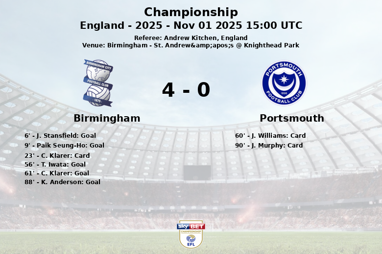 O golpe final foi desferido por K. Anderson aos 88 minutos, selando uma vitória dominante para o Birmingham. Com 19 chutes no total, 7 deles no alvo, o Birmingham demonstrou sua capacidade ofensiva. O Portsmouth, por outro lado, lutou para criar oportunidades, registrando apenas 4 chutes e nenhum no alvo. O árbitro Andrew Kitchen teve uma tarde relativamente tranquila, mostrando um cartão amarelo para cada equipe.
