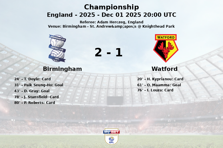 Birmingham, Inglaterra – Em um encontro vibrante realizado no St. Andrew’s @ Knighthead Park, o Birmingham City conquistou a vitória sobre o Watford na 18ª rodada do Championship. A partida, arbitrada por Adam Herczeg, foi marcada pela intensidade e jogo disputado no meio-campo.