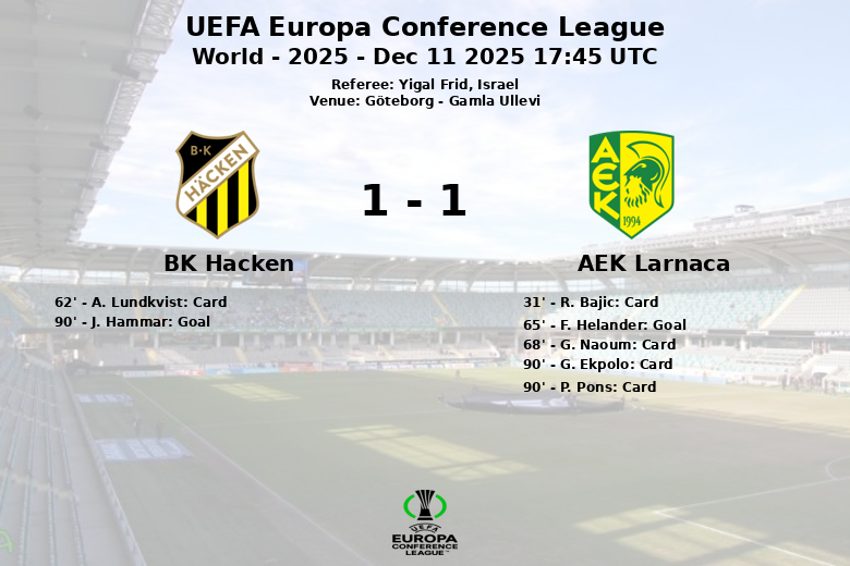 Gotemburgo, 11 de dezembro de 2025 – A partida entre BK Hacken e AEK Larnaca, correspondente à quinta jornada da fase de grupos da UEFA Europa Conference League, disputada no Gamla Ullevi, terminou com um placar de um a um. Apesar do domínio na posse de bola por parte do BK Hacken (59%), o AEK Larnaca soube aproveitar as suas oportunidades. O encontro, arbitrado pelo israelense Yigal Frid, caracterizou-se por um jogo disputado no meio-campo.