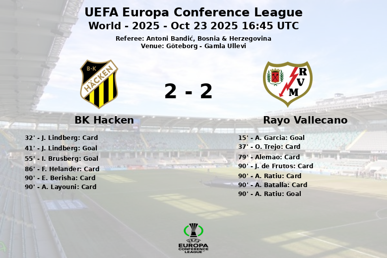 Apesar do domínio na posse de bola (60%), o Rayo Vallecano encontrou dificuldades para concretizar seus ataques, refletido em seus 10 chutes com apenas 3 a gol, enquanto o BK Hacken aproveitou melhor suas oportunidades. A intensidade da partida se traduziu em um elevado número de faltas (14 para o Rayo Vallecano e 10 para o BK Hacken) e uma chuva de cartões amarelos, culminando com um pênalti a favor do Rayo Vallecano, transformado por A. Ratiu aos 90 minutos, selando o empate final. O árbitro Antoni Bandić teve uma tarde ocupada, mostrando um total de 12 cartões amarelos.