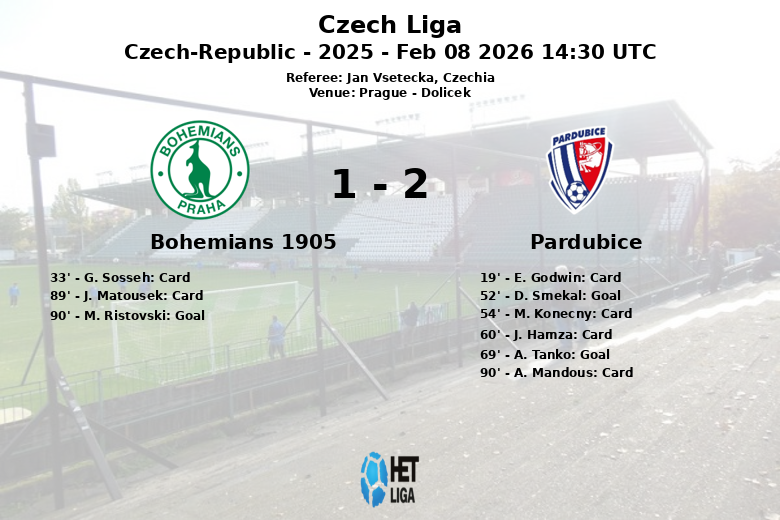 Praga, 8 de fevereiro de 2026 – Em uma partida disputada no Dolicek em Praga, o Pardubice garantiu uma importante vitória contra o Bohemians 1905 na 21ª jornada da Liga Tcheca. O jogo, marcado por alta tensão, viu o Pardubice assumir a liderança com um gol de D. Smekal aos 52 minutos, com assistência de R. Mahuta. Apesar de jogar com dez homens desde os 19 minutos devido ao cartão vermelho de E. Godwin, o Pardubice conseguiu manter a compostura e ampliar a vantagem com um gol de A. Tanko aos 69 minutos.