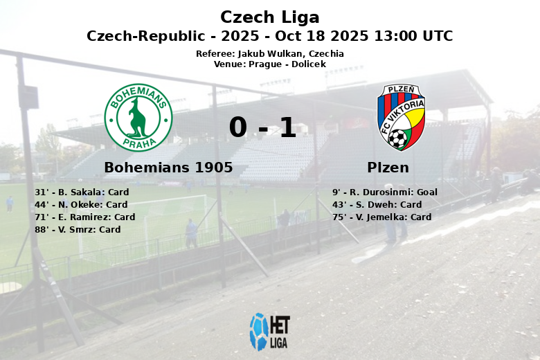 Praga, República Tcheca – Em um jogo disputado no Dolicek, em Praga, o Plzen saiu vitorioso contra o Bohemians 1905. O único gol da partida surgiu logo no início, aos 9 minutos, cortesia de R. Durosinmi, assistido por A. Memic, dando ao Plzen uma vantagem que manteria até o fim.