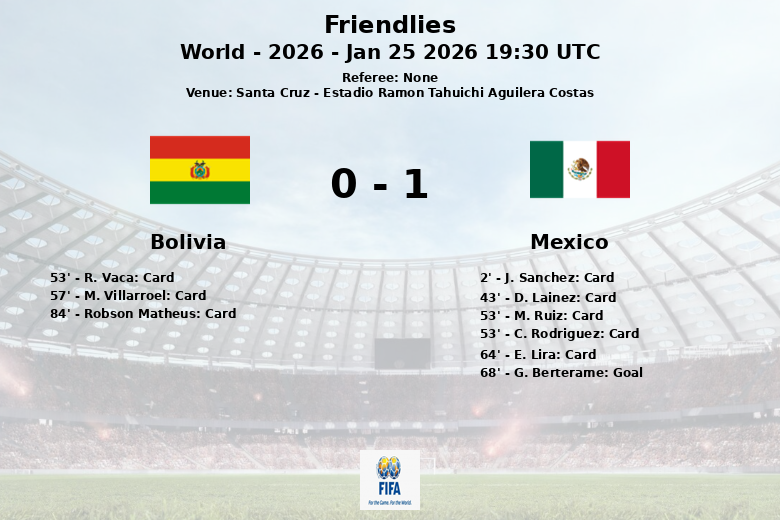 Em uma partida acirrada realizada no Estádio Ramón Tahuichi Aguilera Costas em Santa Cruz, o México garantiu uma vitória de 1 a 0 sobre a Bolívia em um amistoso internacional. O jogo, marcado por um alto número de cartões, principalmente para o lado mexicano, permaneceu equilibrado por grande parte do tempo. A posse de bola foi dividida igualmente, com 50% para cada equipe. No entanto, foi o México quem conseguiu quebrar o empate aos 68 minutos com um gol de G. Berterame, assistido por E. del Villar.