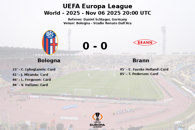 O árbitro Daniel Schlager teve uma noite ocupada, mostrando vários cartões amarelos para ambas as equipes. J. Miranda, L. Ferguson e V. Italiano foram advertidos pelo Bologna, enquanto E. Fauske Helland e T. Pedersen receberam cartões amarelos pelo Brann. A partida, correspondente à quarta rodada da fase de grupos da UEFA Europa League, deixou um gosto amargo para ambas as equipes, que precisarão melhorar sua eficácia em frente ao gol nas próximas partidas. O Bologna gerou mais perigo com 11 escanteios em comparação com os 3 do Brann.