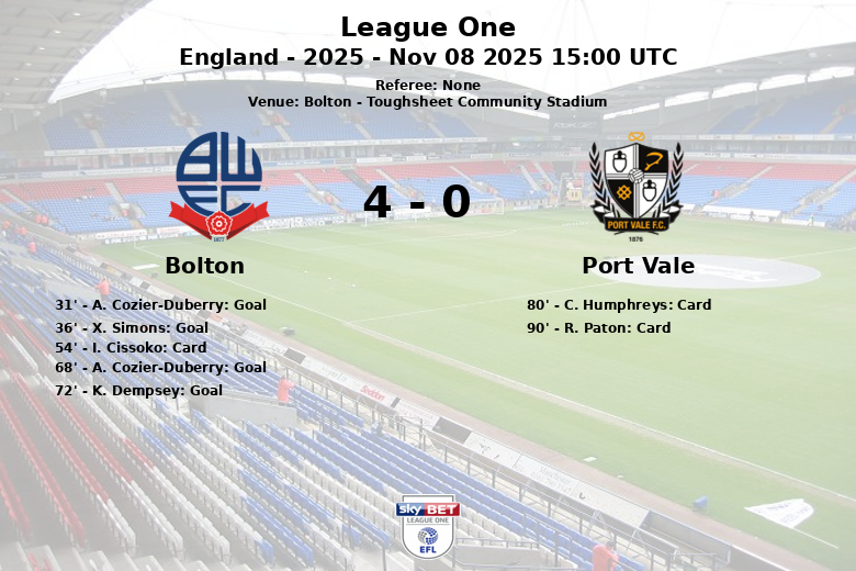Bolton, Inglaterra – Em um confronto disputado no Toughsheet Community Stadium, o Bolton Wanderers demonstrou sua superioridade sobre o Port Vale em uma partida válida pela 15ª rodada da League One. Com uma posse de bola dominante de 64%, o Bolton ditou o ritmo do jogo desde o início.