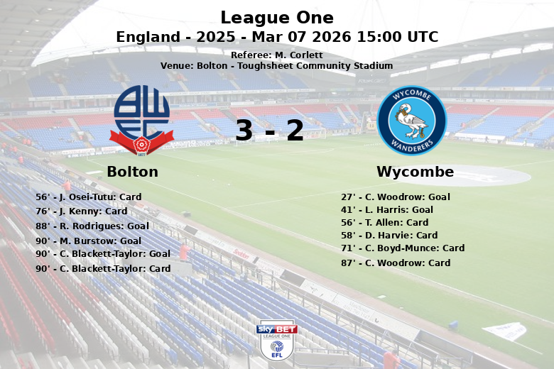 Bolton, Inglaterra – Em um confronto eletrizante realizado no Toughsheet Community Stadium, o Bolton protagonizou uma remontada impressionante para vencer o Wycombe com o placar final de 3 a 2. O Wycombe, jogando fora de casa, dominou o primeiro tempo com gols de C. Woodrow aos 27 minutos e L. Harris aos 41 minutos, deixando o Bolton com a necessidade urgente de reagir.