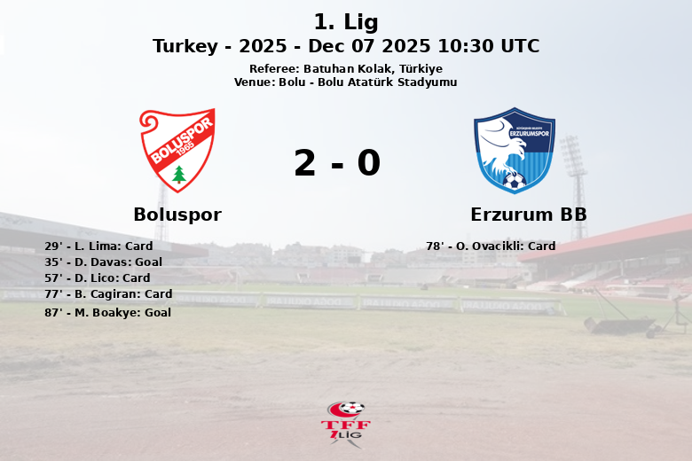 O primeiro gol da partida aconteceu aos 35 minutos, marcado por D. Davas, que aproveitou uma assistência de L. Lima para colocar o Boluspor à frente. A partida foi marcada por um jogo intenso e disputado, refletido nos quatro cartões amarelos mostrados (três para o Boluspor e um para o Erzurum BB). L. Lima também recebeu um cartão amarelo aos 29 minutos, mas contribuiu com uma assistência.