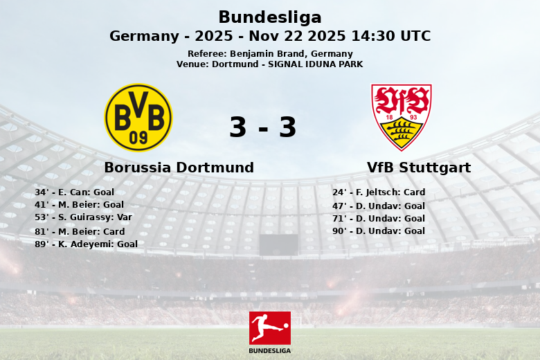 O placar foi aberto aos 34 minutos com um pênalti convertido por E. Can para o Dortmund. A alegria local durou pouco, já que M. Beier ampliou a vantagem aos 41 minutos, com assistência de S. Guirassy. No entanto, o Stuttgart reagiu com força. D. Undav descontou para o Stuttgart aos 47 minutos, após uma assistência de B. El Khannouss. Um gol de Guirassy foi anulado pelo VAR aos 53 minutos por impedimento. Undav voltou a marcar aos 71 minutos, desta vez com assistência de M. Mittelstadt, igualando o placar. K. Adeyemi devolveu a vantagem ao Dortmund aos 89 minutos, assistido por M. Beier, mas Undav completou seu hat-trick aos 90 minutos, com assistência de C. Fuhrich, selando o empate final. A partida, arbitrada por Benjamin Brand, foi caracterizada por um jogo intenso e disputado no meio-campo, com ambas as equipes buscando constantemente o gol adversário. O Dortmund realizou 14 chutes (6 no gol e 4 para fora) e cometeu 12 faltas, enquanto o Stuttgart realizou 15 chutes (6 no gol e 6 para fora) e cometeu 9 faltas.
