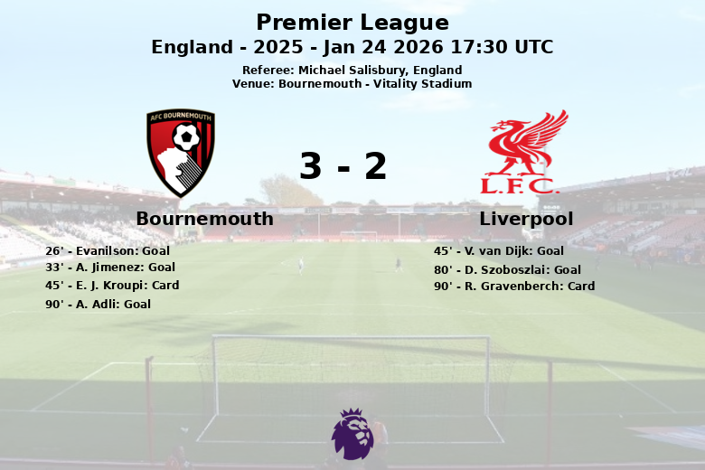 No segundo tempo, o Liverpool continuou a pressionar, e D. Szoboszlai marcou aos 80 minutos, assistido por M. Salah, para colocar os Reds na frente. No entanto, o Bournemouth mostrou garra e, no último minuto do tempo regulamentar, A. Adli empatou, selando um empate que deixou ambas as equipes com sentimentos agridoce. O árbitro Michael Salisbury mostrou um cartão amarelo para cada equipe, E.J. Kroupi do Bournemouth e R. Gravenberch do Liverpool. O Liverpool gerou 14 remates com 3 à baliza, enquanto o Bournemouth, com 9 remates, teve 4 à baliza.