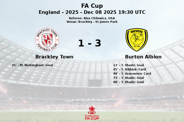 Brackley, Inglaterra – Num jogo realizado no St James Park, o Burton Albion saiu vitorioso contra o Brackley Town com um placar de três a um, em partida válida pela fase de 128 avos da FA Cup. O Burton Albion dominou a posse de bola com 64%, gerando um total de 17 chutes, com sete no alvo.